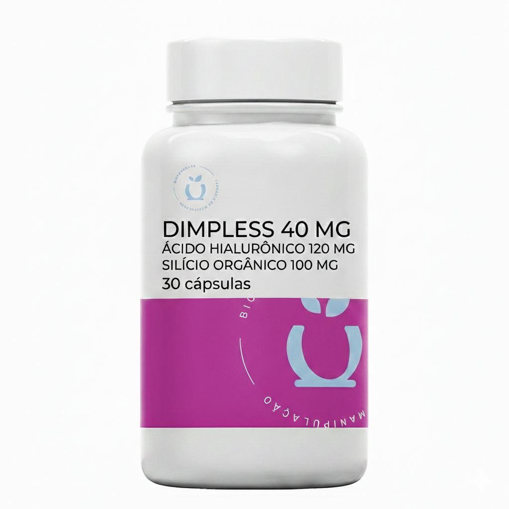 Dimpless® (extrato de melão rico em SOD) – 40 mg Ácido Hialurônico (hialuronato de sódio) – 120 mg Silício Orgânico – 100 mg Excipiente q.s.p.